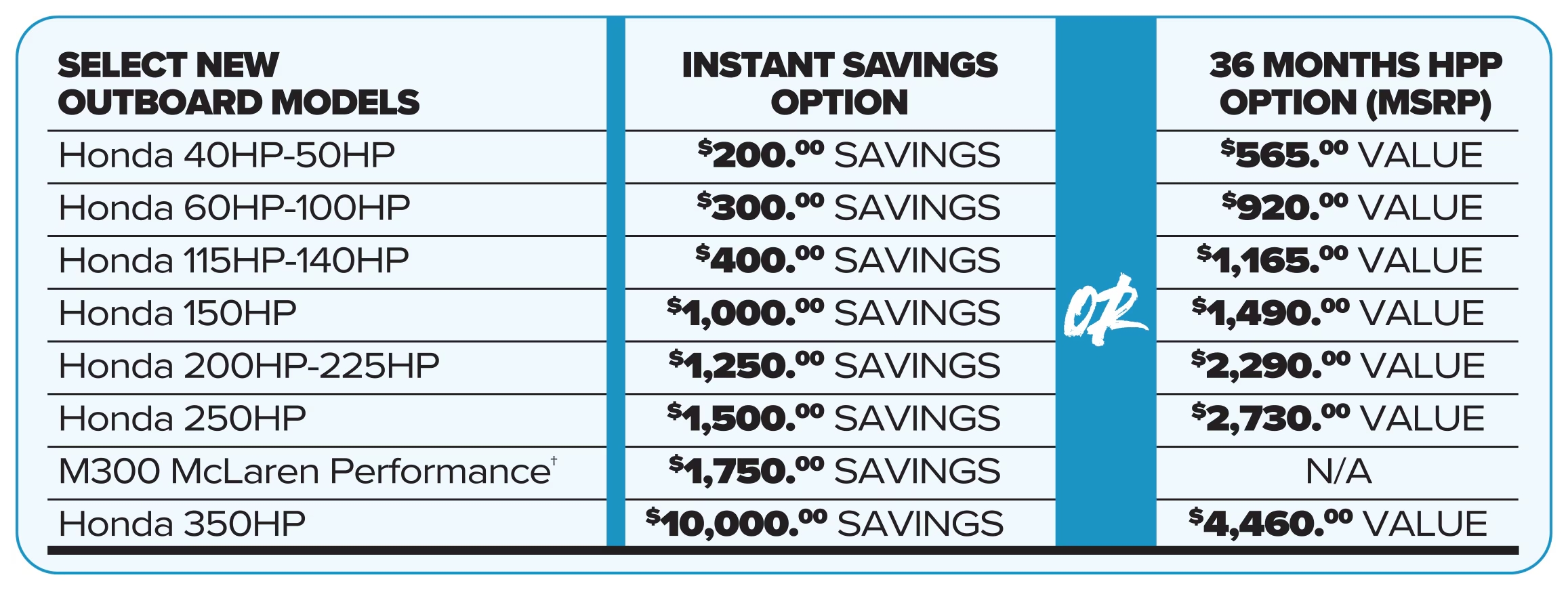 *At participating Honda Marine dealers only. Qualified retail customers may receive savings off the selling price of a Honda powered boat package or Honda Marine engine(s) sold for repower. This promotion is limited to new Honda Marine BF40–BF350 outboard engines, 2021 and newer models, in stock, sold and delivered between January 5, 2026, and April 30, 2026, delivered to a US resident. May be combined with certain other promotions. Only Honda Marine outboard engines sold for personal use qualify for this promotion. Fleet, rental, commercial, and government sales, demo engines, and engines sold under special pricing/promotions including (but not limited to) guides, brand ambassadors, and tournament fishermen are ineligible. Dealers set their own pricing. Actual contract coverages, limitations, and exclusions may vary. HondaCare Protection Plan® not available in South Carolina. 36-month HondaCare Protection Plan® does not apply to the M300 model. Honda Marine reserves the right to modify, amend, cancel or revoke, in whole or in part, this promotion at any time without prior notice. All Honda outboards meet EPA and CARB emission levels. Always wear a personal flotation device while boating and read your owner’s manual.